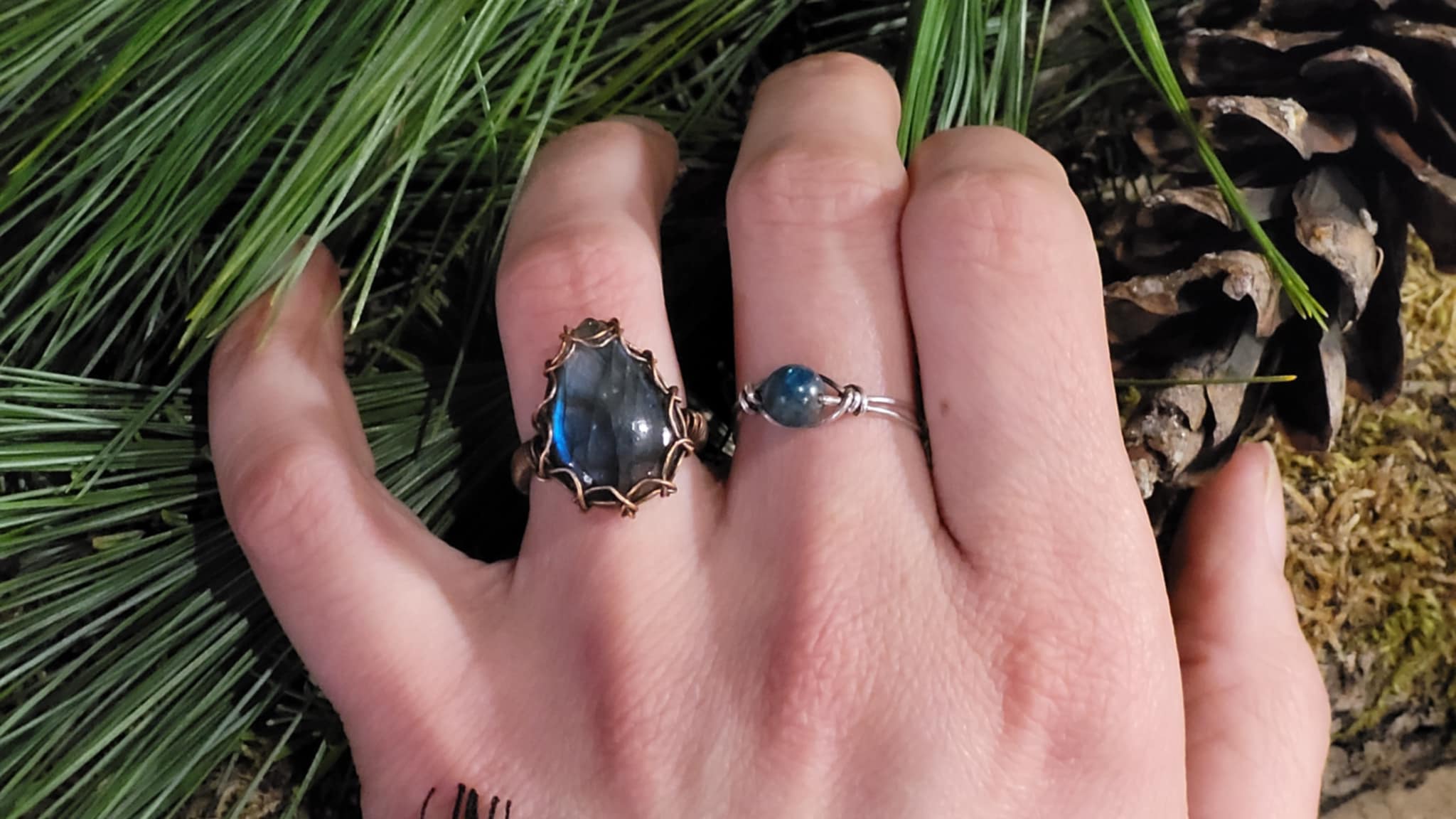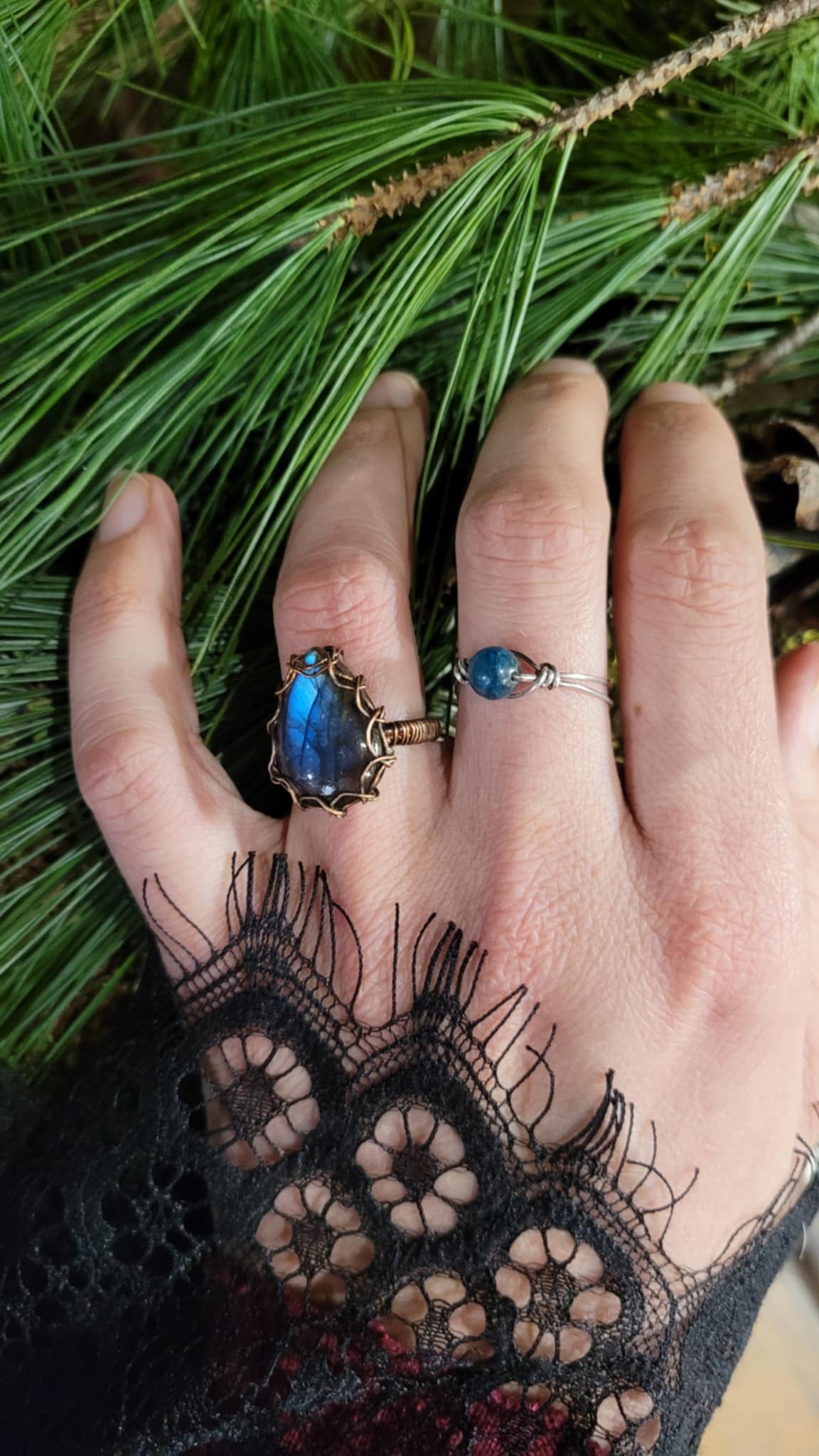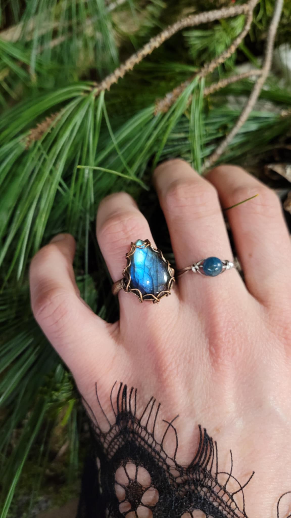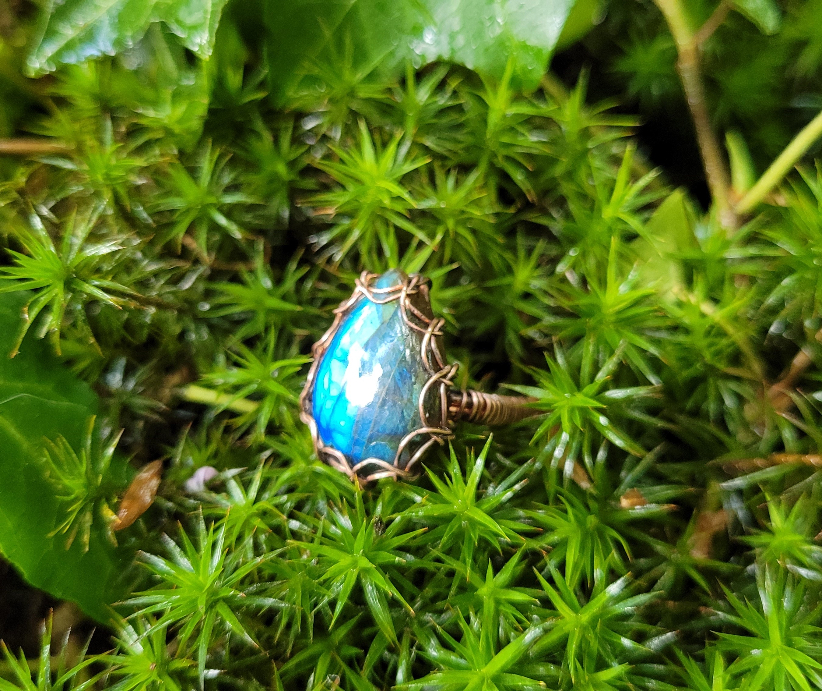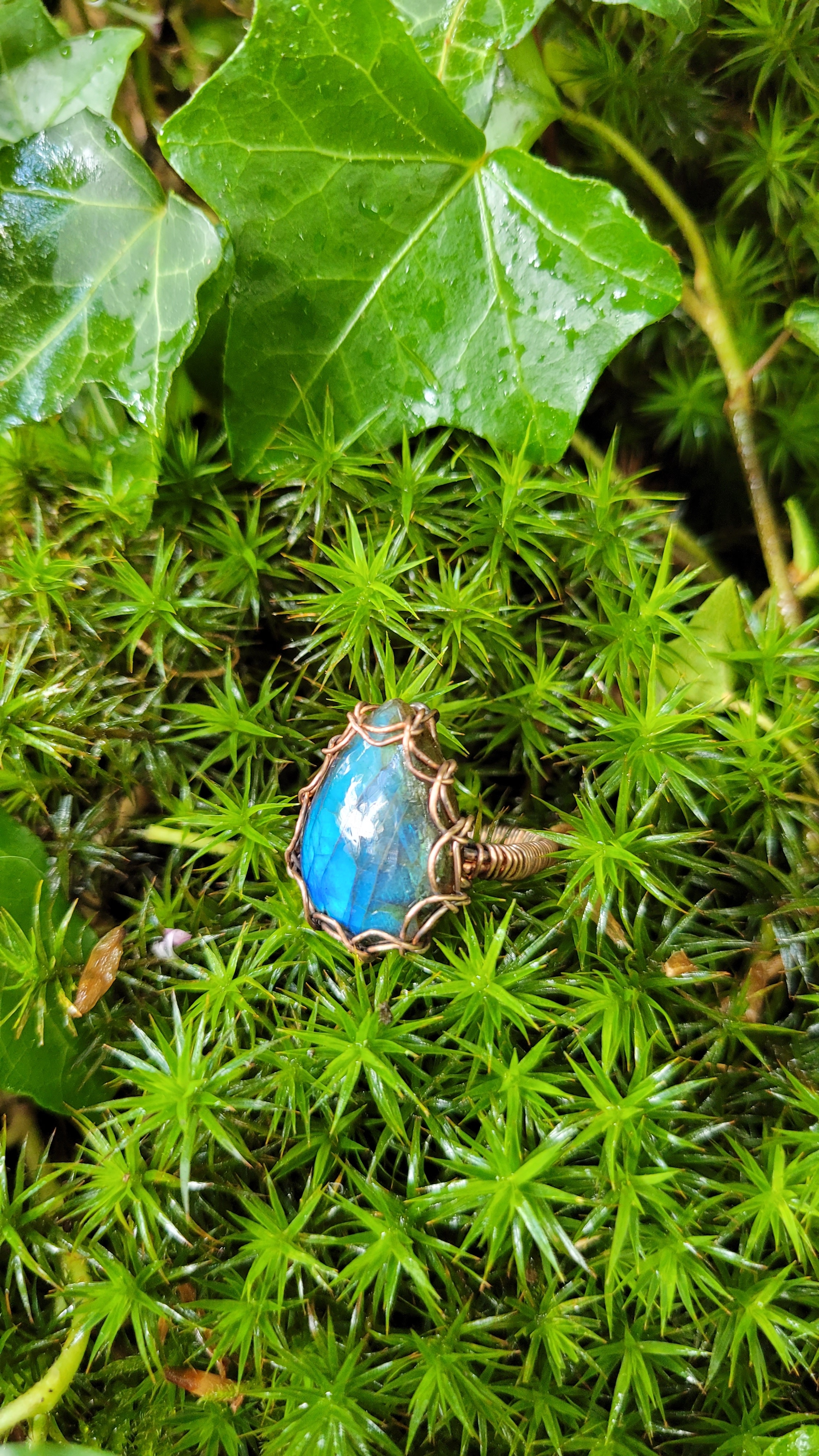Bague créé avec un cabochon goutte en labradorite aux reflets bleu / gris /vert /pailleté / marron (selon l'exposition et la lumière).