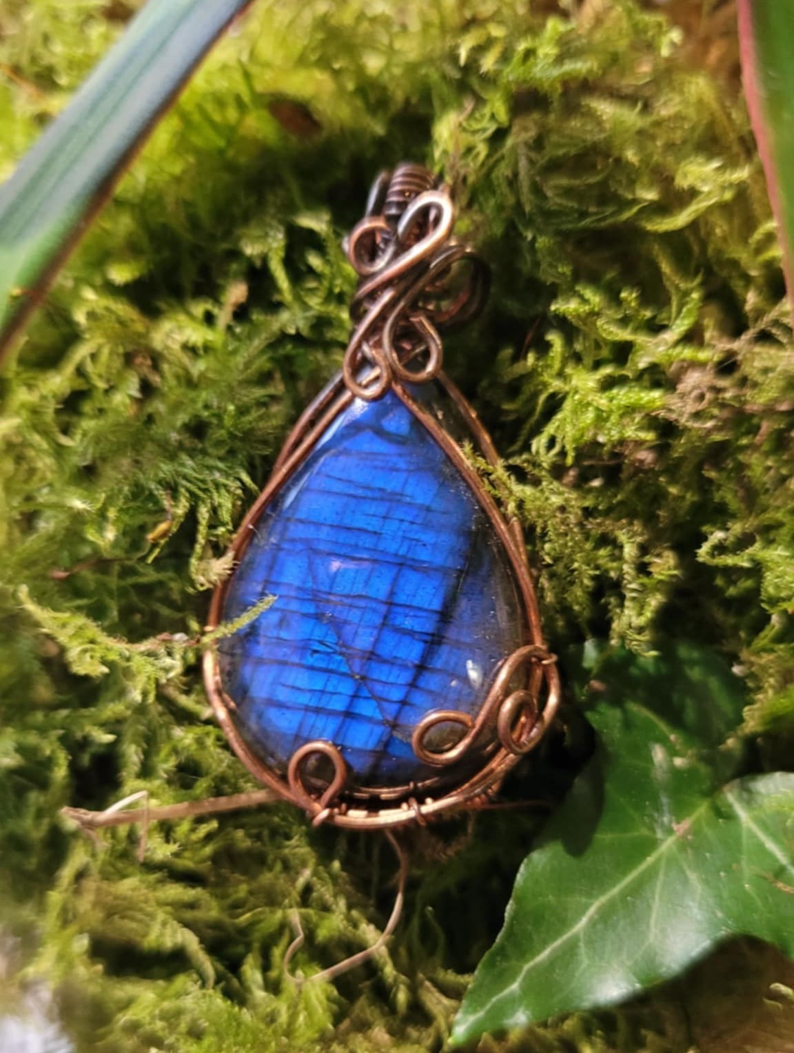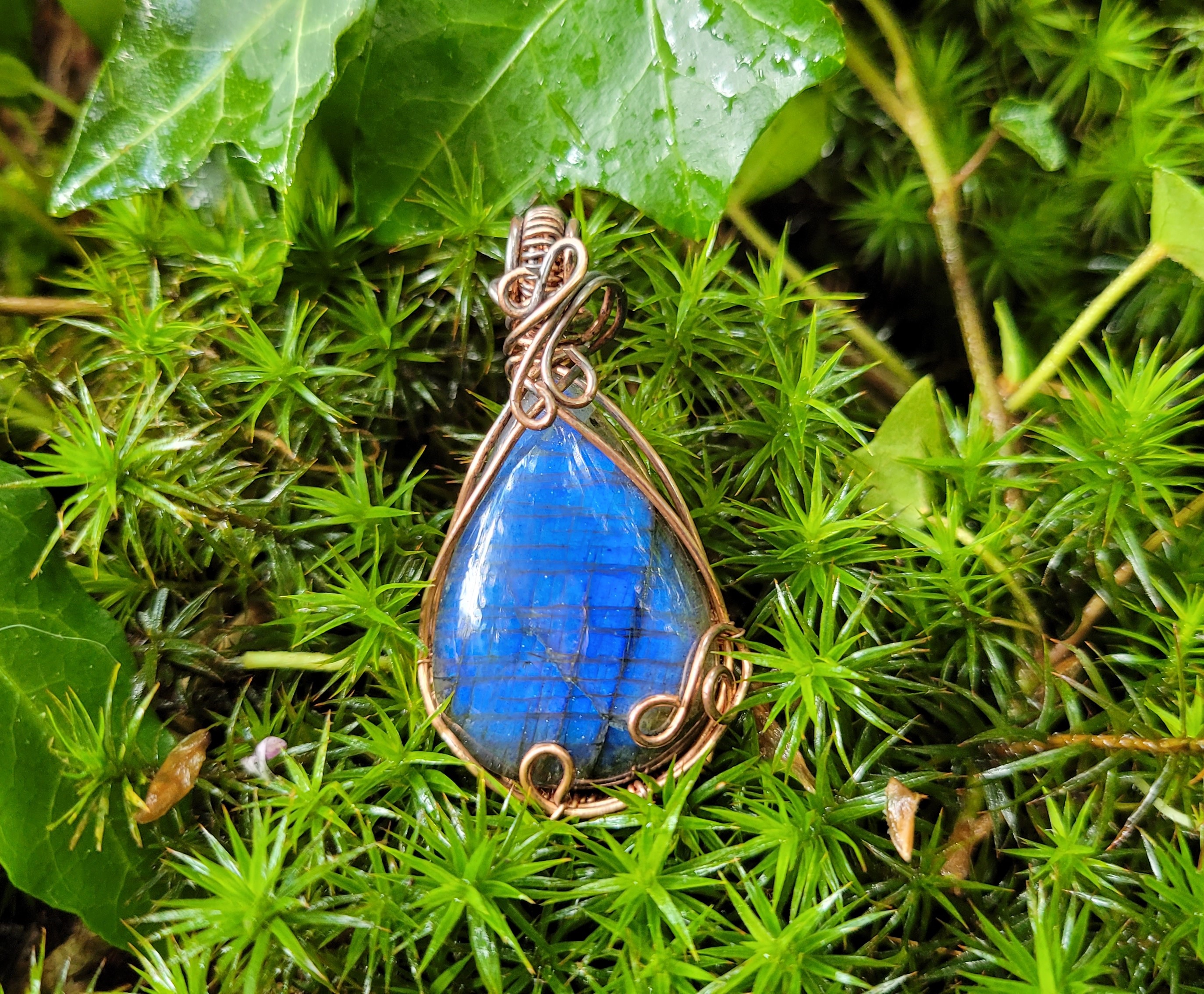 Pendentif créé avec un cabochon goutte en labradorite aux reflets bleus.