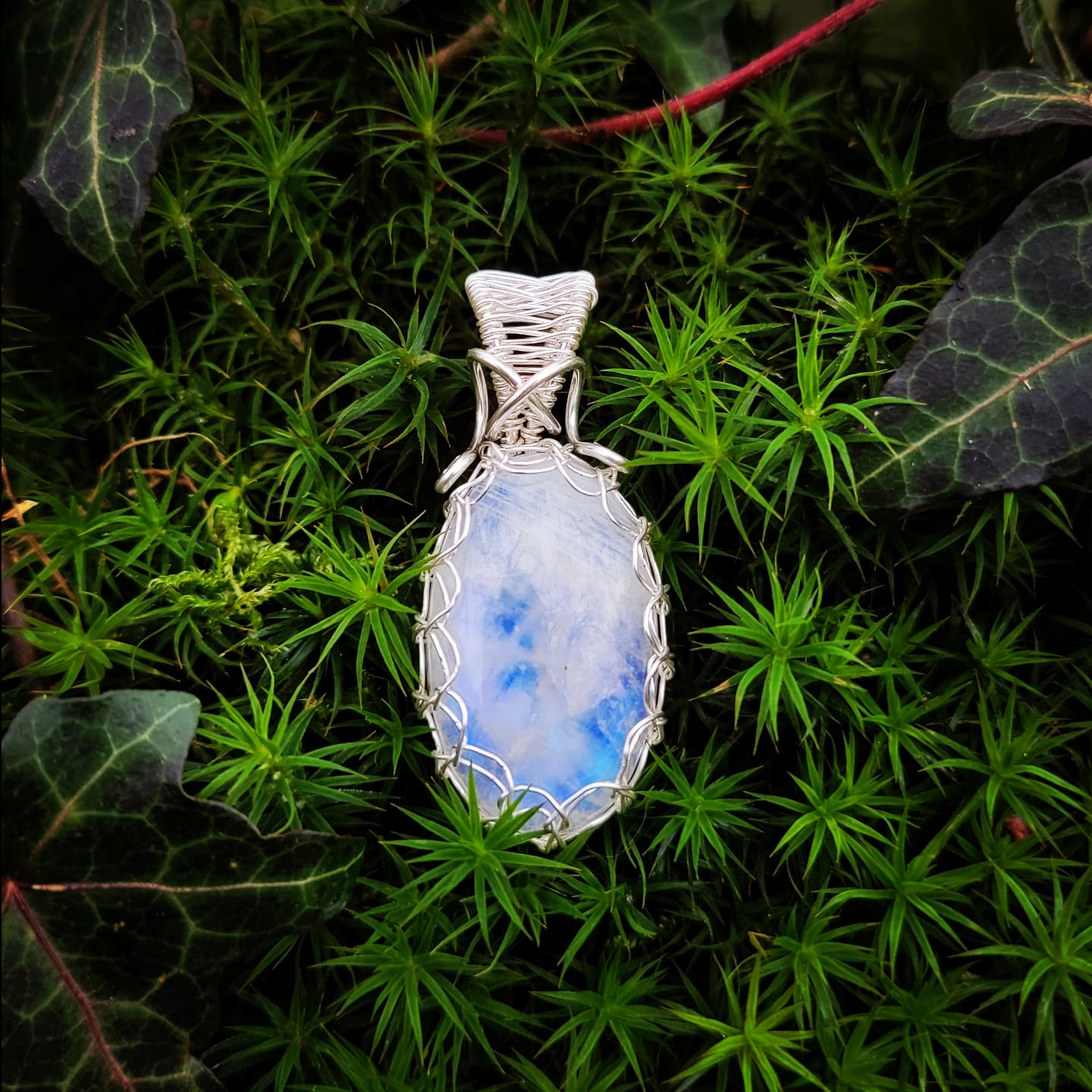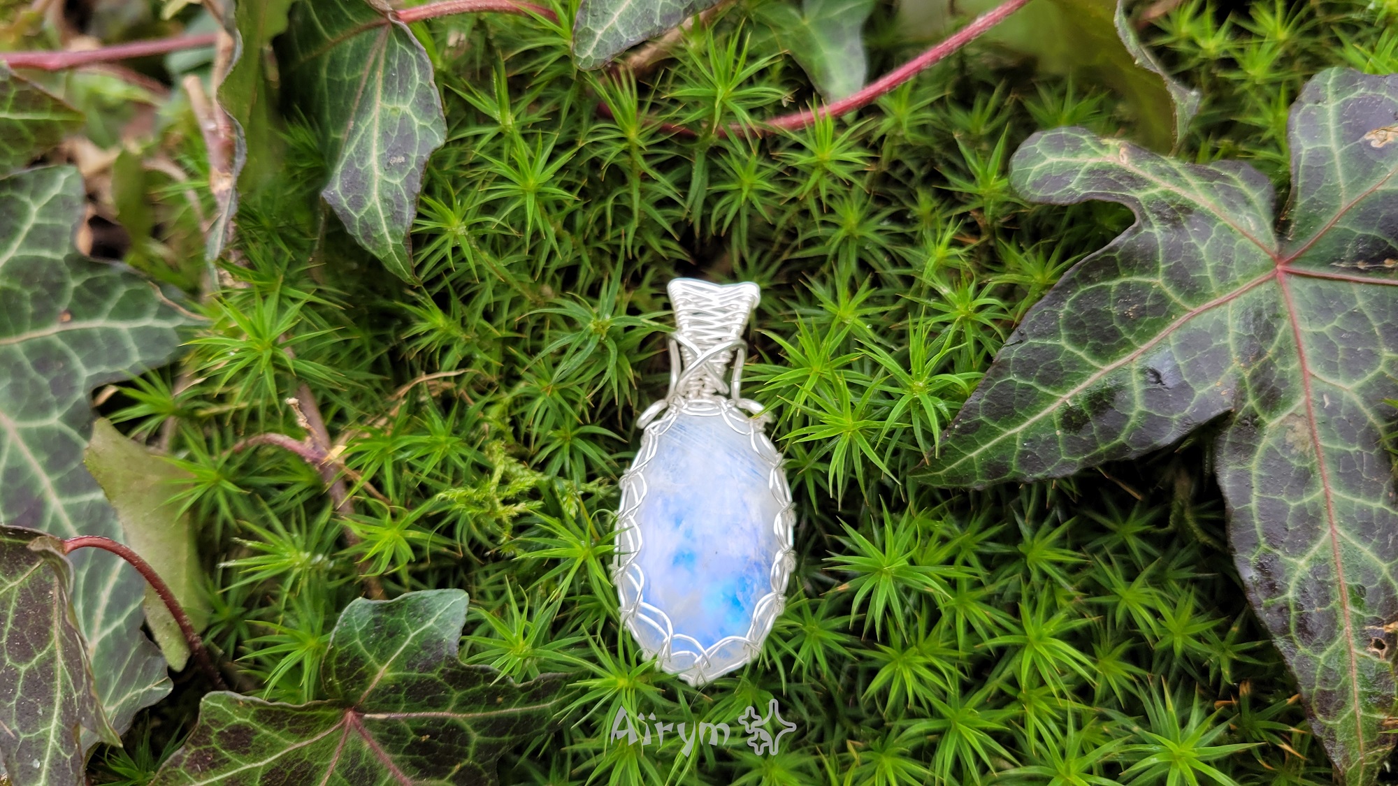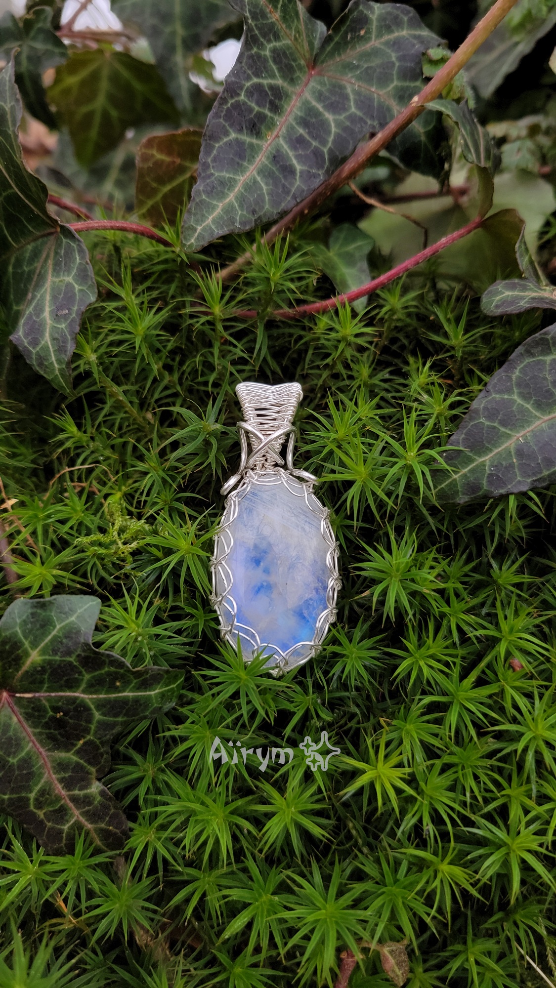 Pendentif créé avec un cabochon en labradorite blanche (pierre de lune arc en ciel) aux reflets bleutés (selon l'exposition et la lumière).