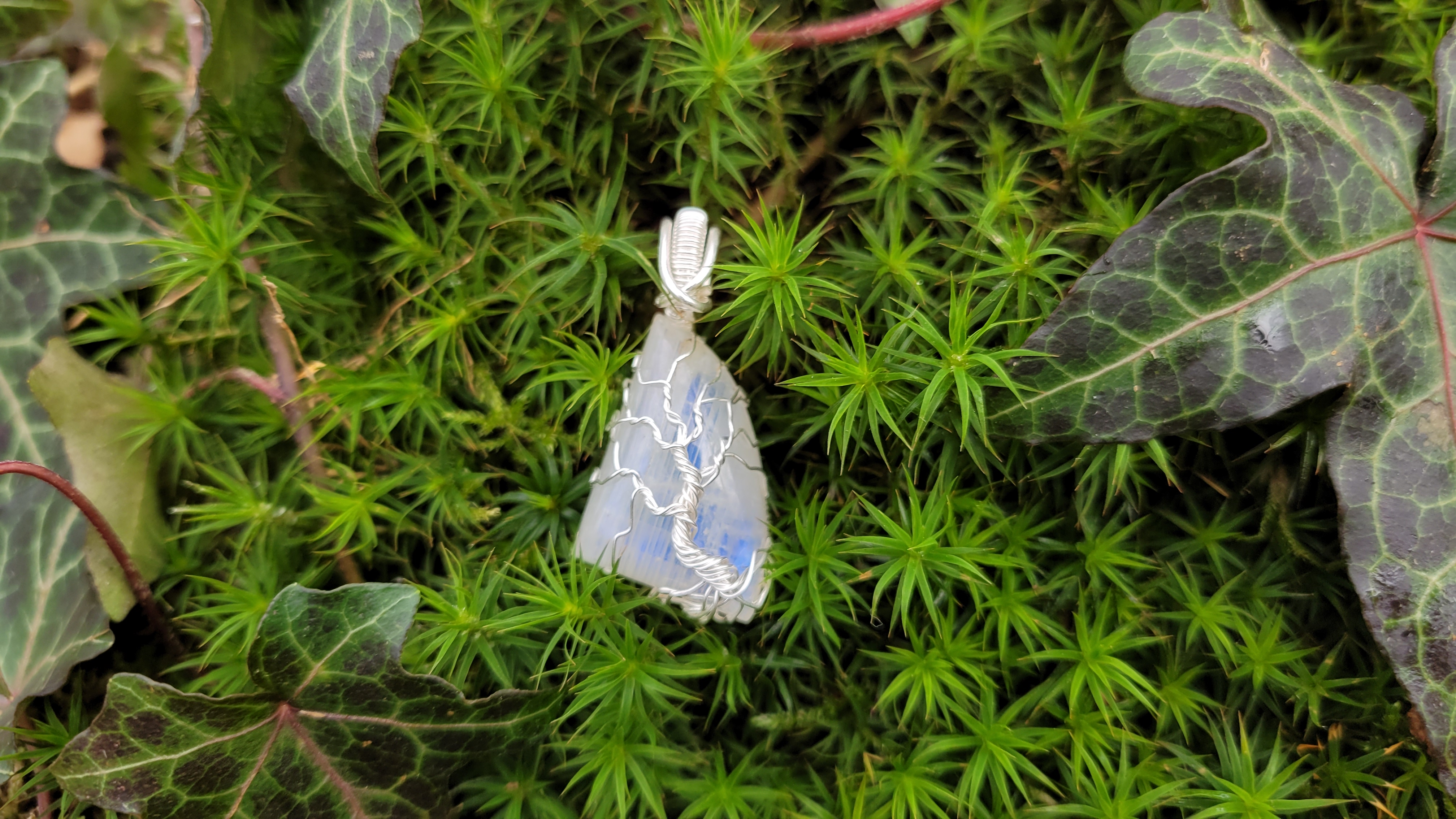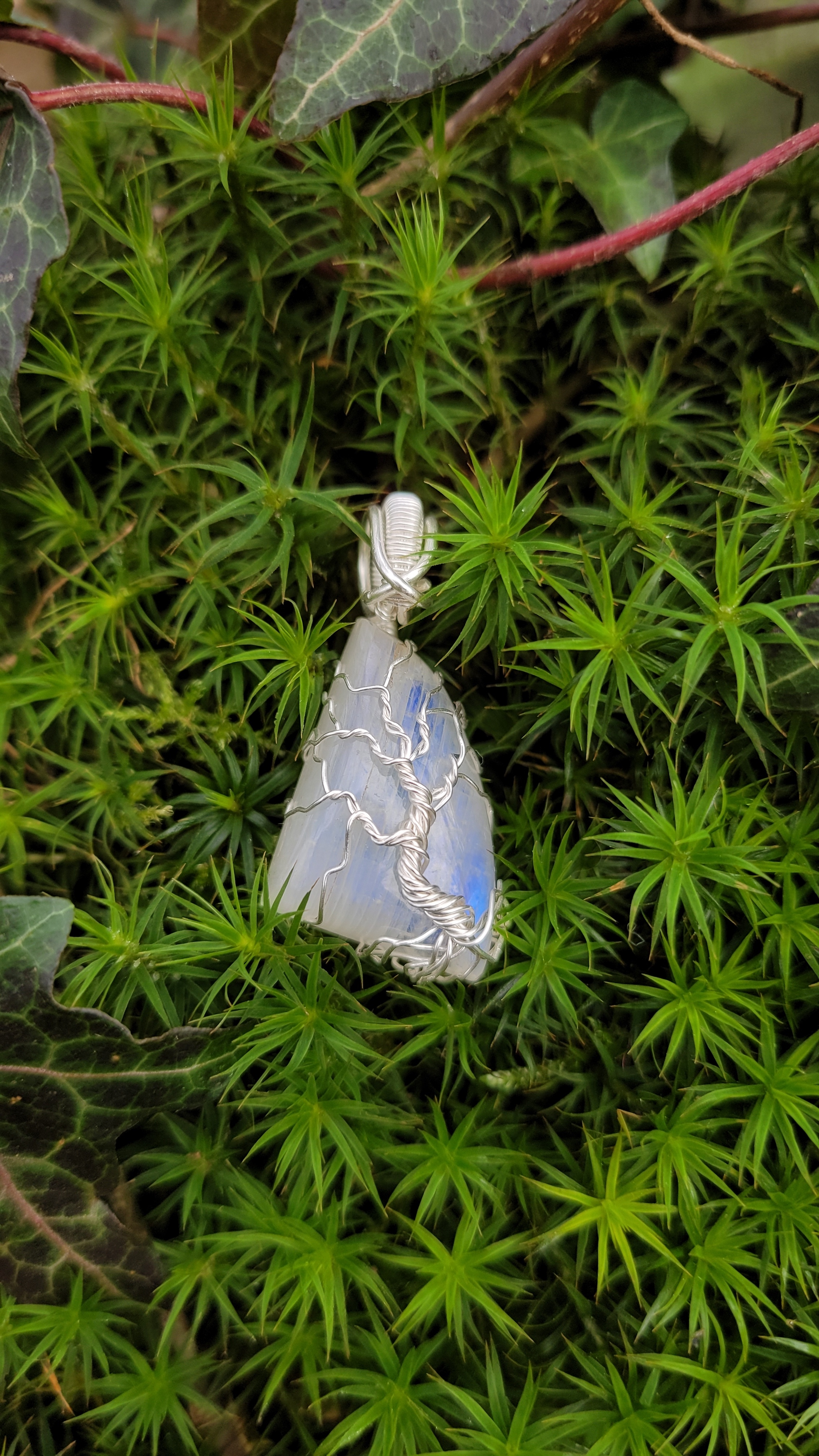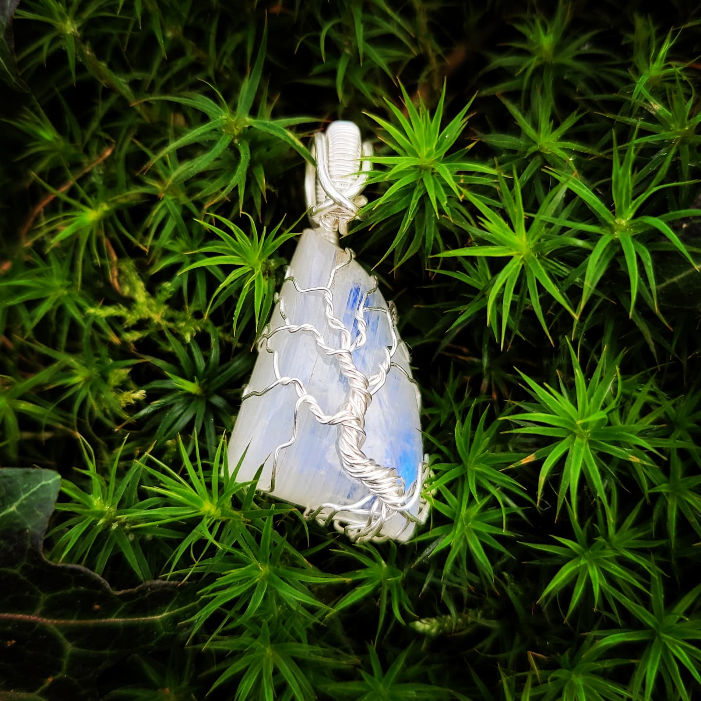 Pendentif arbre de vie, créé avec un cabochon goutte en labradorite blanche (pierre de lune arc en ciel) aux légers reflets bleutés (selon l'exposition et la lumière).